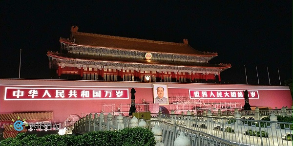 天安門方向可以看到天安們城樓的主視圖,天安門中間懸掛的是毛主席的巨幅畫像,兩邊懸掛的標語分別是“中華人民共和國萬歲”和“世界人民大團結(jié)萬歲”使用的是的6毫米欣海光擴散板,用來制作標語,十分美觀大方。
